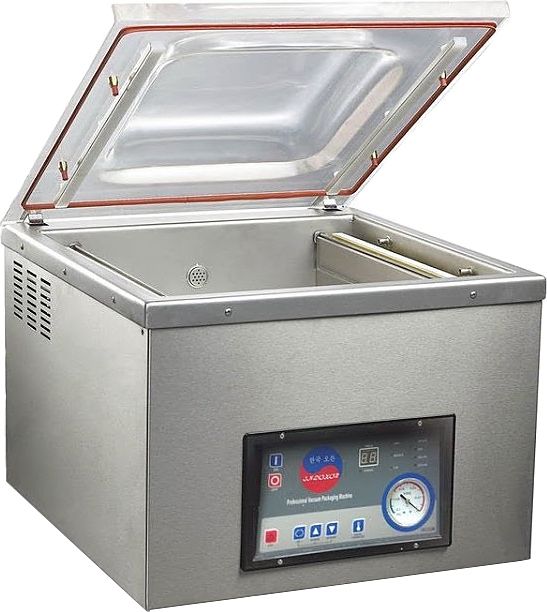 Установка настольная, 1 камера 450x370x170(220) мм, длина планки 350 мм, ширина сварочного шва 8 мм, время запайки 20-45 сек, производительность 1-2 упаковок/мин, производительность насоса 20 м3/ч, функция упаковки в газ.