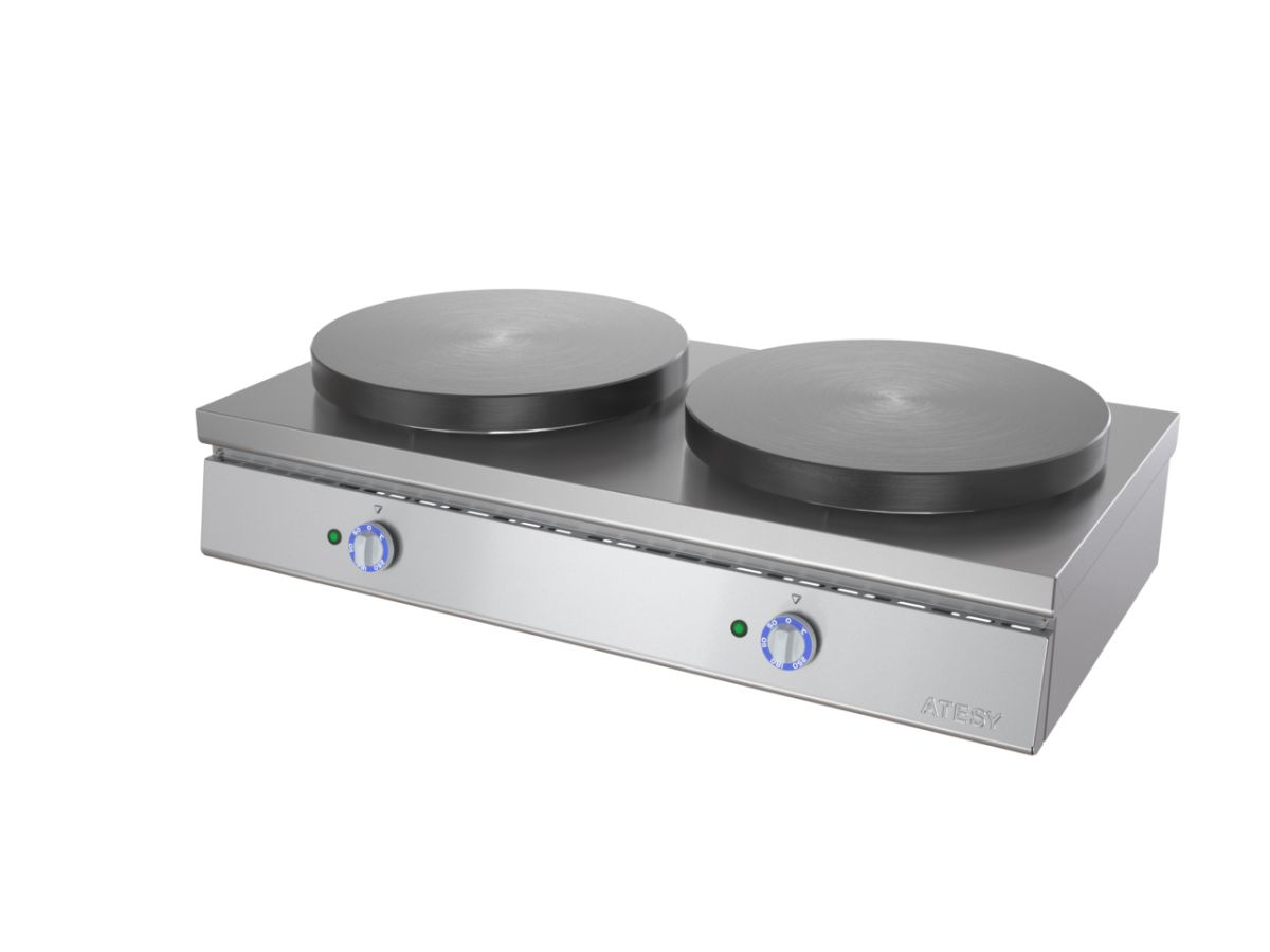 Две рабочих поверхности диаметром 360 мм, материал жарочной поверхности чугун, температурный режим от 50 до 250°С, производительность 60 блинов/час.