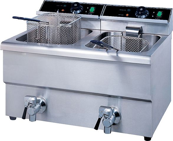 2 ванны, объем 12+12 л, корпус нерж.сталь, краны для слива масла, размер корзины 242х193х142 мм.