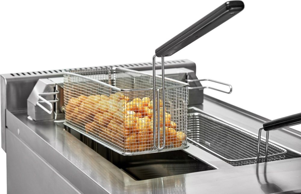 2 корзины, размеры корзины 400х150х130 мм, вместимость 36 (2х18) дм3, макс. загрузка продукта не более 2 (2х1) кг, время разогрева масла 17 мин.