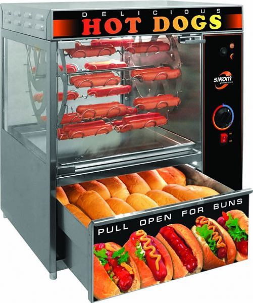 Вертел на 44 сосиски, подогреваемый ящик для булочек.