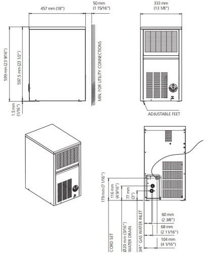 Проточного типа, водяной тип охлаждения, вместимость бункера 6 кг, производительность 20 кг/сутки, форма льда кубик bistrot (по форме напоминающие наперсток), масса кубика 20 гр.