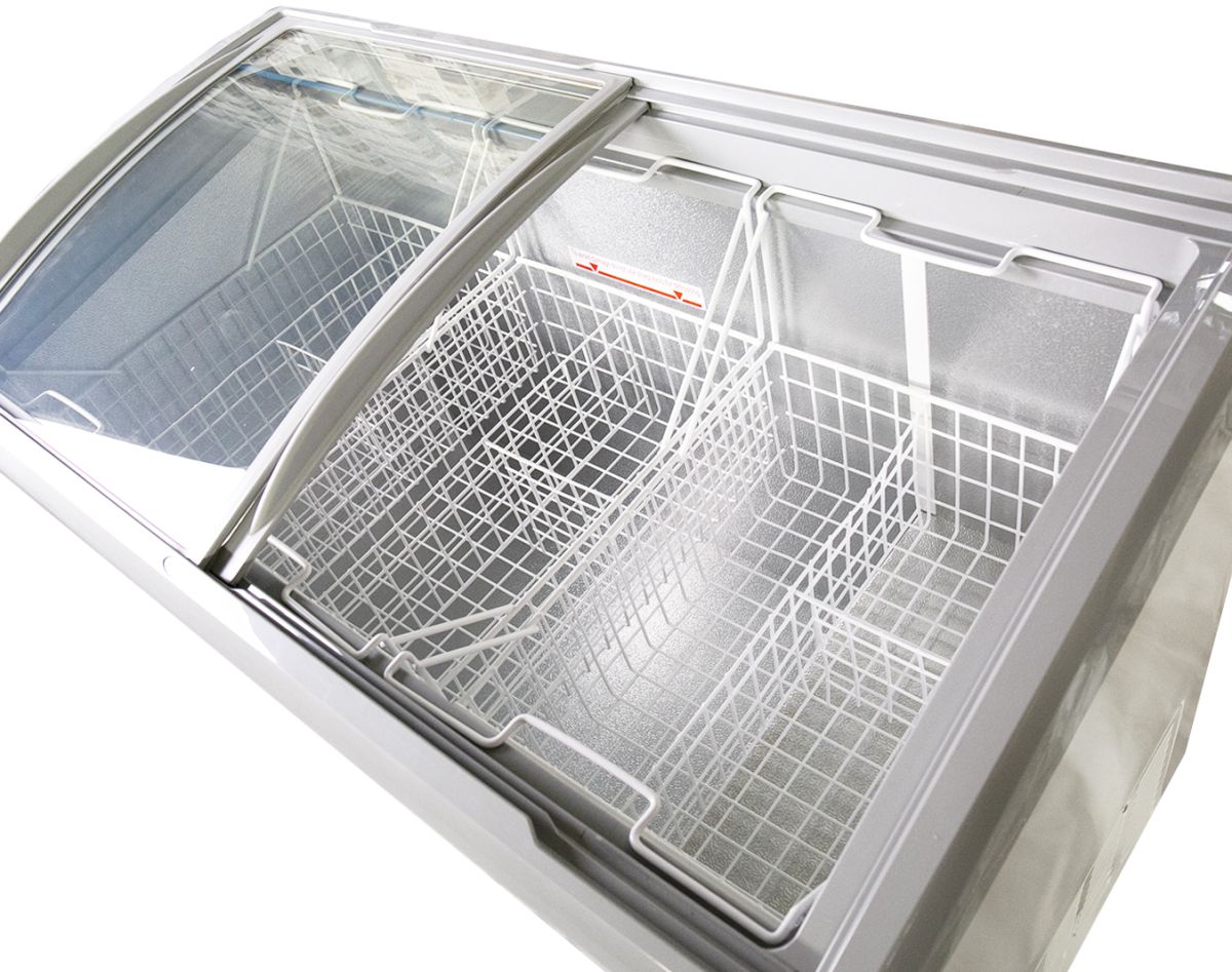 - Морозильная витрина с двойным гнутым стеклом подходит для продажи мороженого и полуфабрикатов, для перемещения витрина оснащена колесиками;