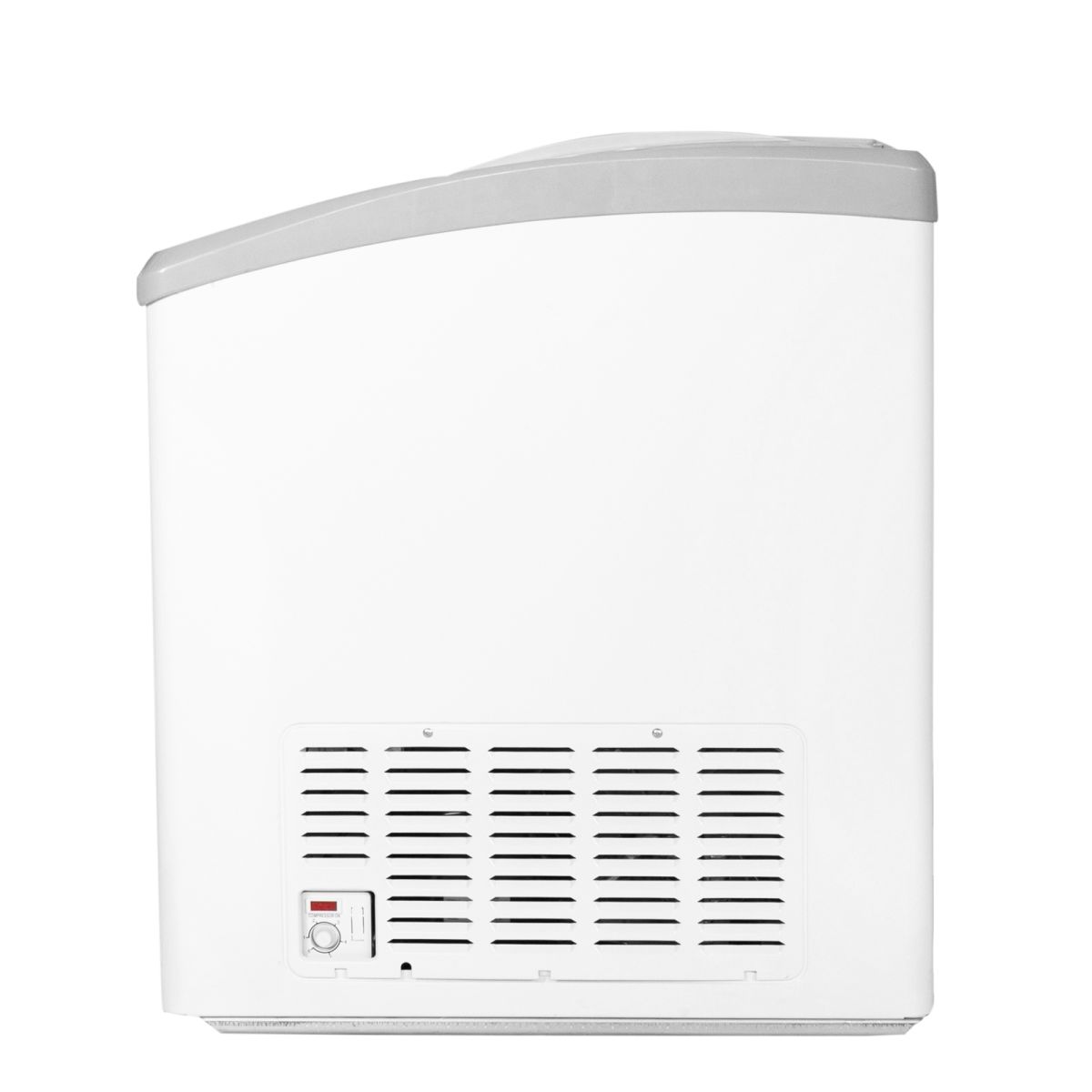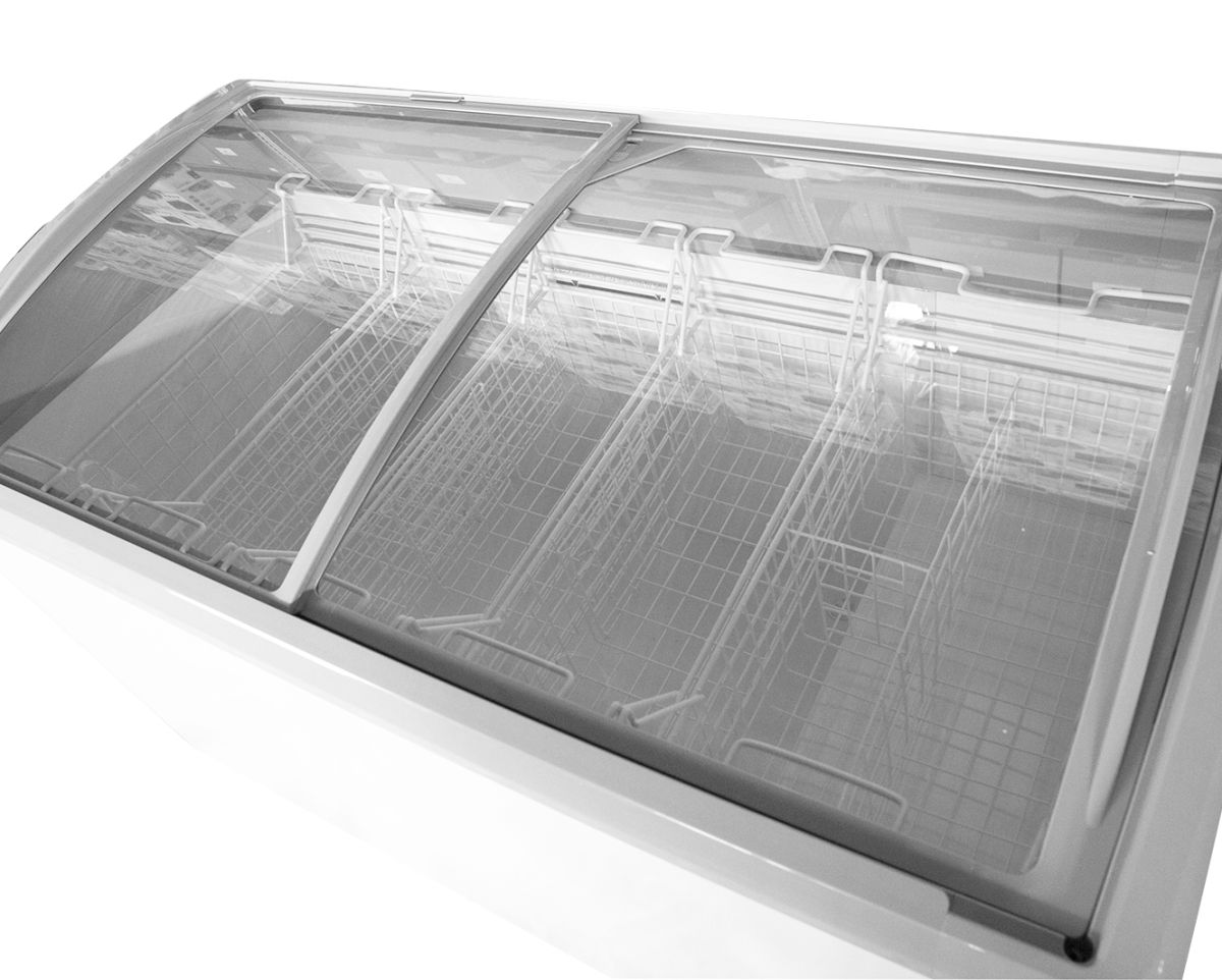 - Морозильная витрина с двойным гнутым стеклом подходит для продажи мороженого и полуфабрикатов, для перемещения витрина оснащена колесиками;