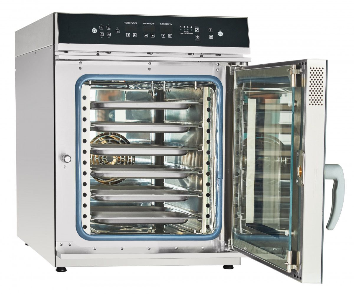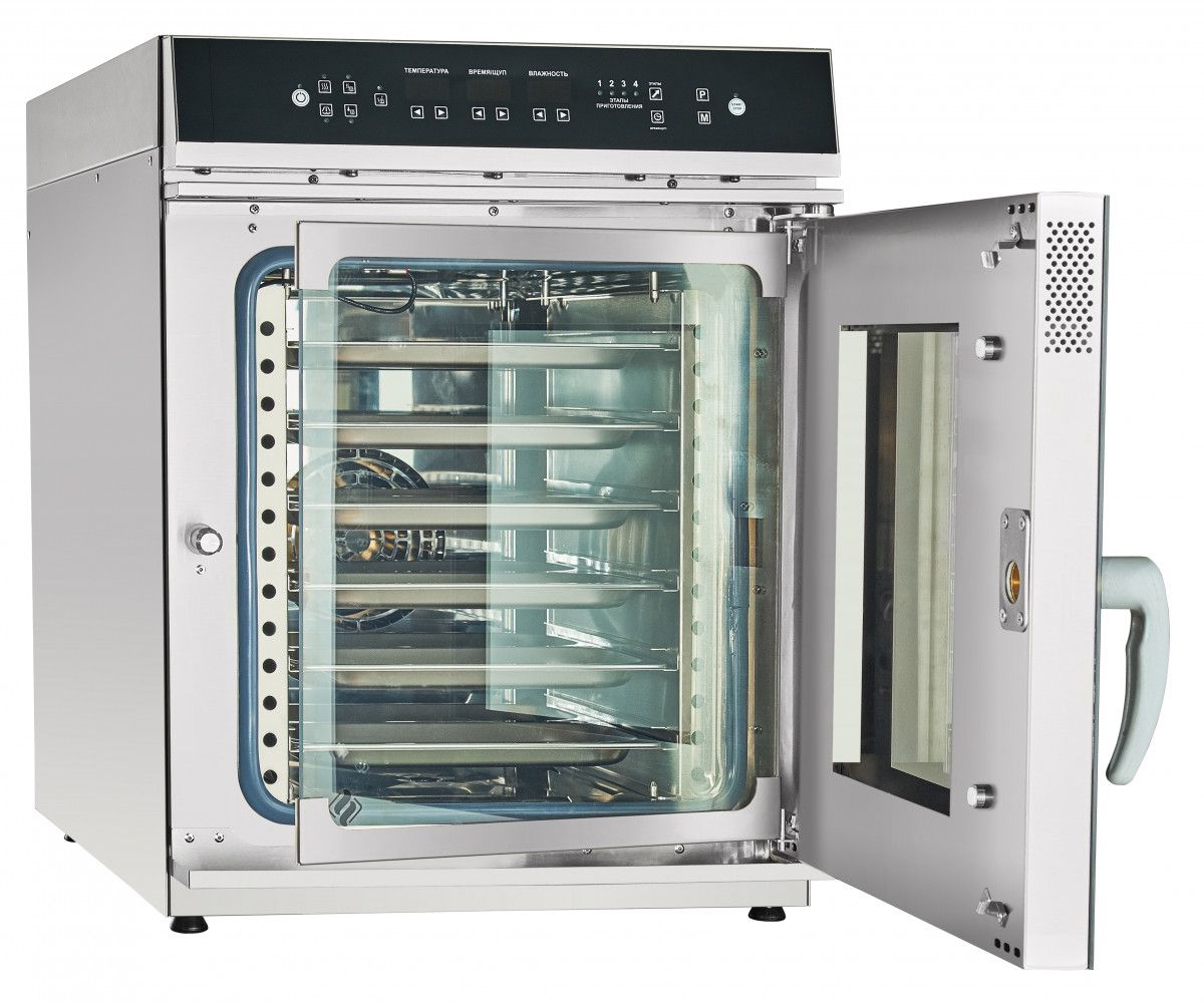 - Режимы: конвекция (+30°С...+270°С), конвекция + пар (+30°С...+250°С), разогрев с паром (+30°С...+160°С), низкотемпературный пар (+30°С...+98°С), пар (+100°С);