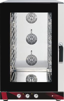 12 уровней, расстояние между уровнями 67 мм, тип направляющих GN 1/1 + 600х400, максимальная температура 260°C, инжекторное парообразование, 3 вентилятора с реверсом, режим бесконечного времени приготовления, без мойки.