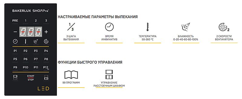 - Электронная панель управления версии LED, позволяет регулировать степень увлажнения во время цикла выпекания и обеспечивает деликатную вентиляцию для выпечки особых изделий;