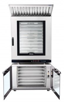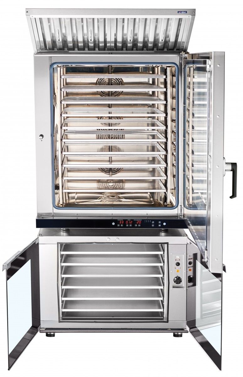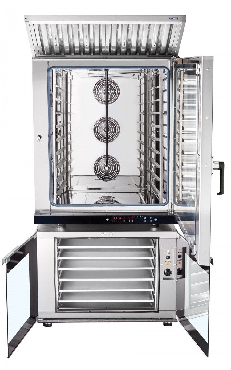 10 уровней, 600х400 мм, нерж. камера и корпус, электронная панель, пароувлажнение, регулировка влажности от 0 до 100%, реверс, память на 110 программ, до 4 этапов в программе, без противней.