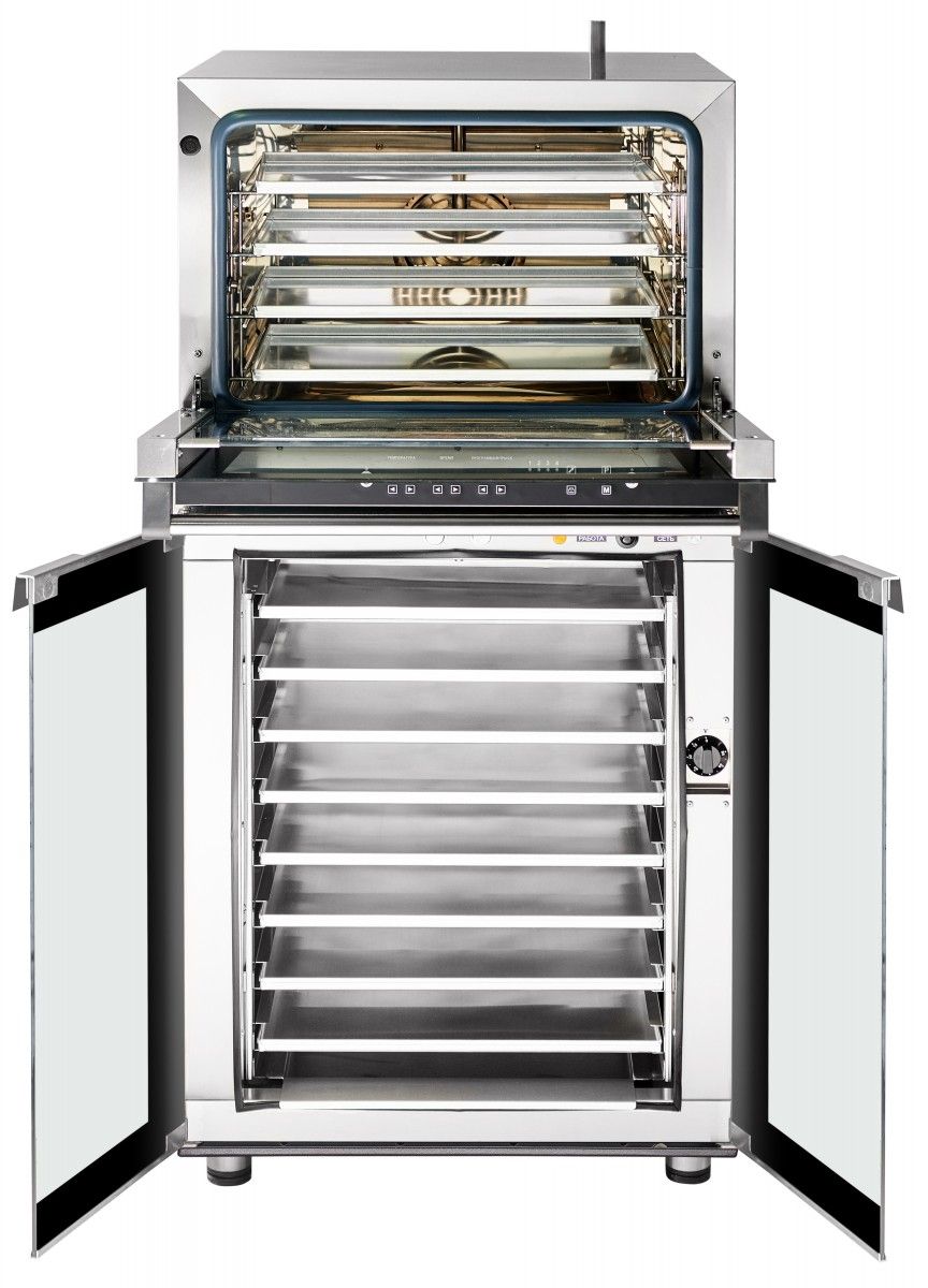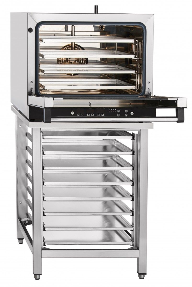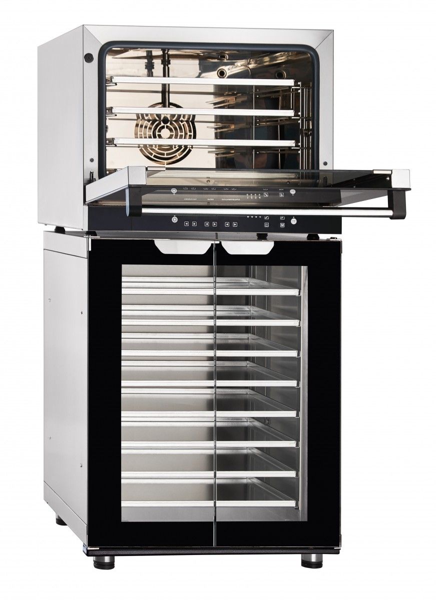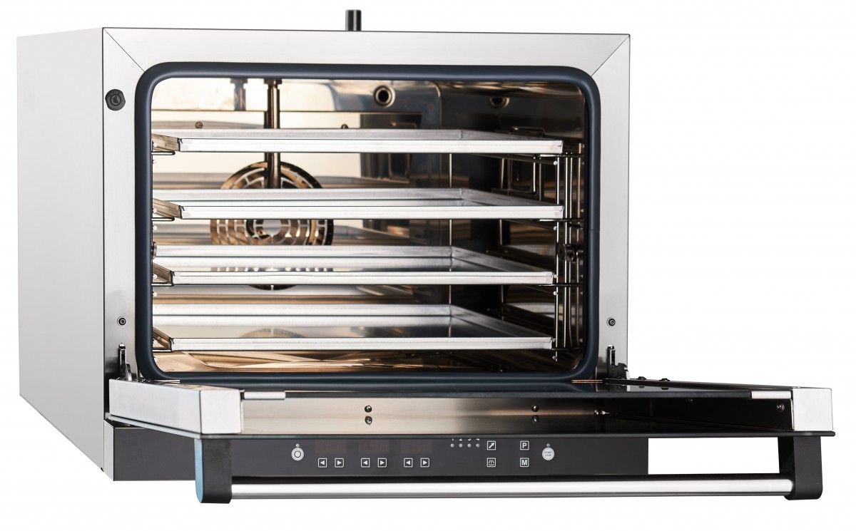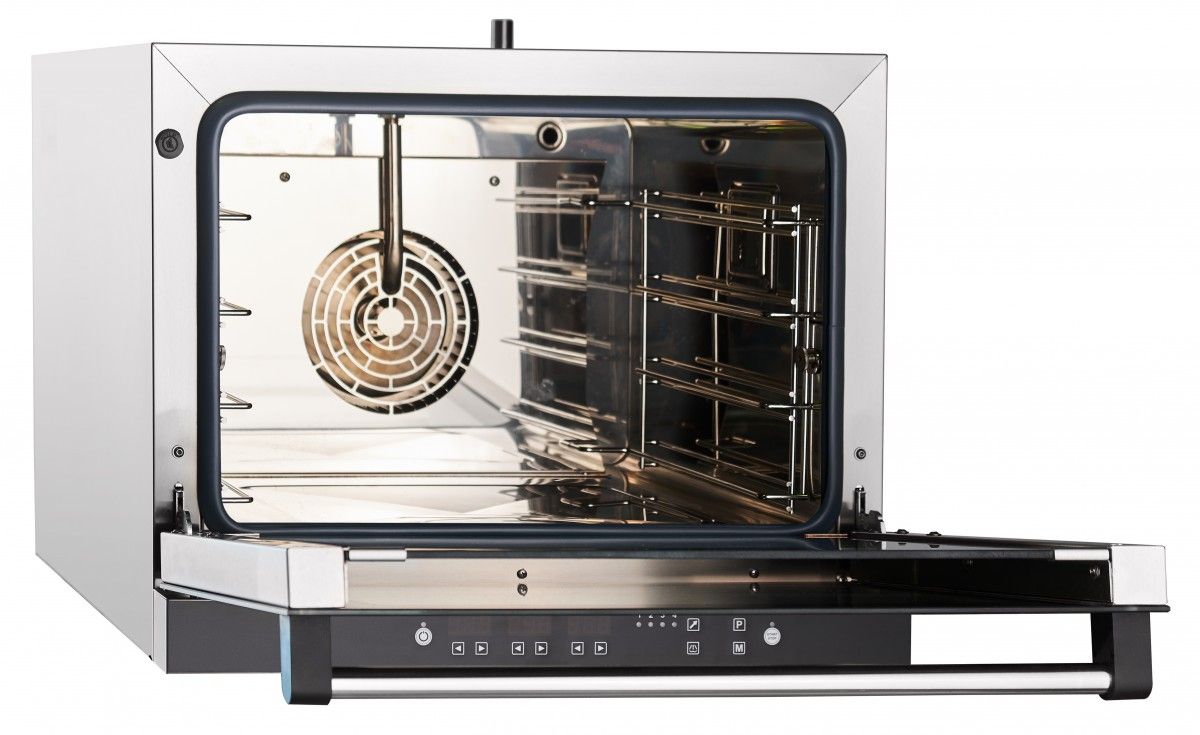 4 уровня, 460х330 мм, нерж. камера и корпус, электронная панель, пароувлажнение, регулировка влажности от 0 до 100%, реверс, память на 110 программ, до 4 этапов в программе, без противней.