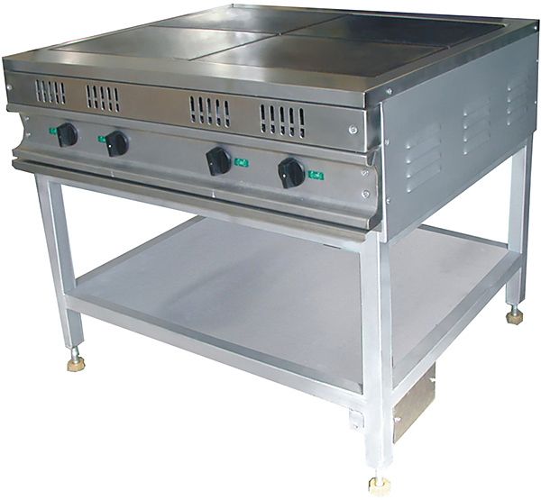 4 конфорки, конфорка сплошная стальная поверхность, температурный режим конфорки 400°С.