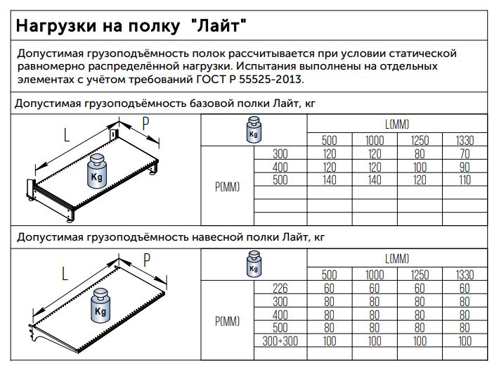 - Грузоподъемность навесной полки Лайт 80 кг;