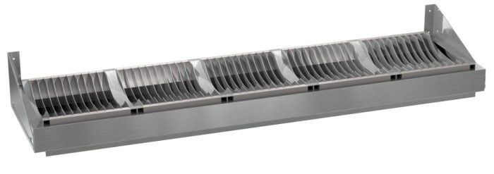 Полка настенная открытая, 1 уровень с вертикальными секциями для 50 тарелок, косынками вверх, состоит из пластиковой кассеты, каркаса и поддона из нержавеющей стали AISI 430.