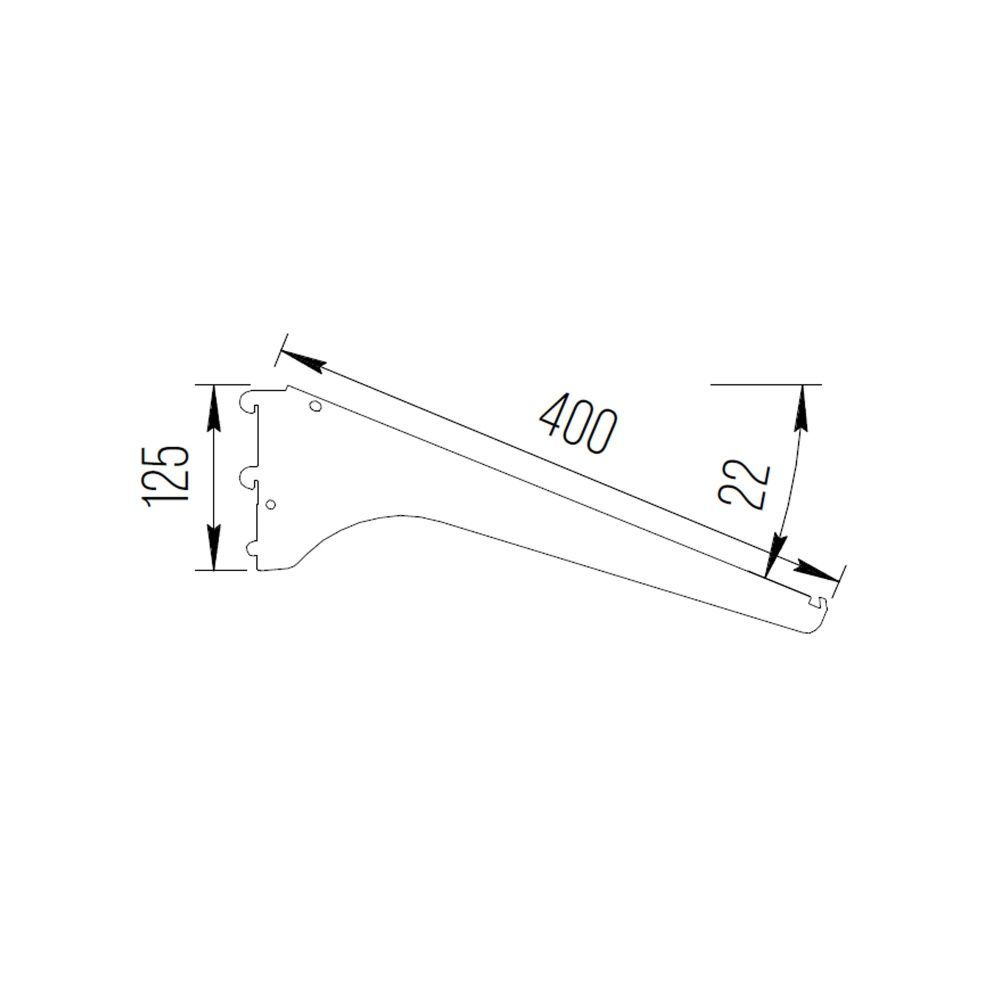 Кронштейн наклонный (22 градуса) для торгового стеллажа, длина 400 мм, выполнен из металла с защитным покрытием.