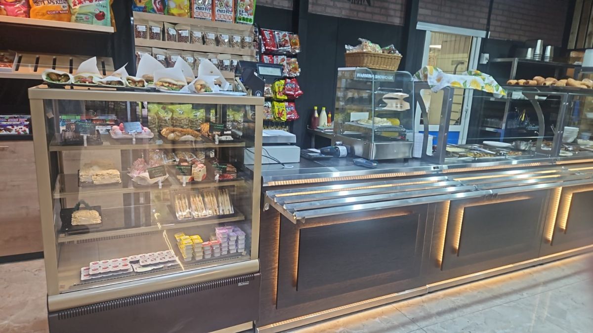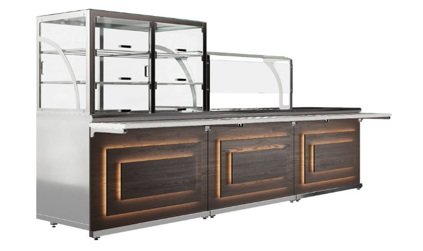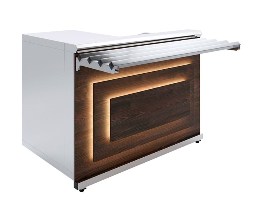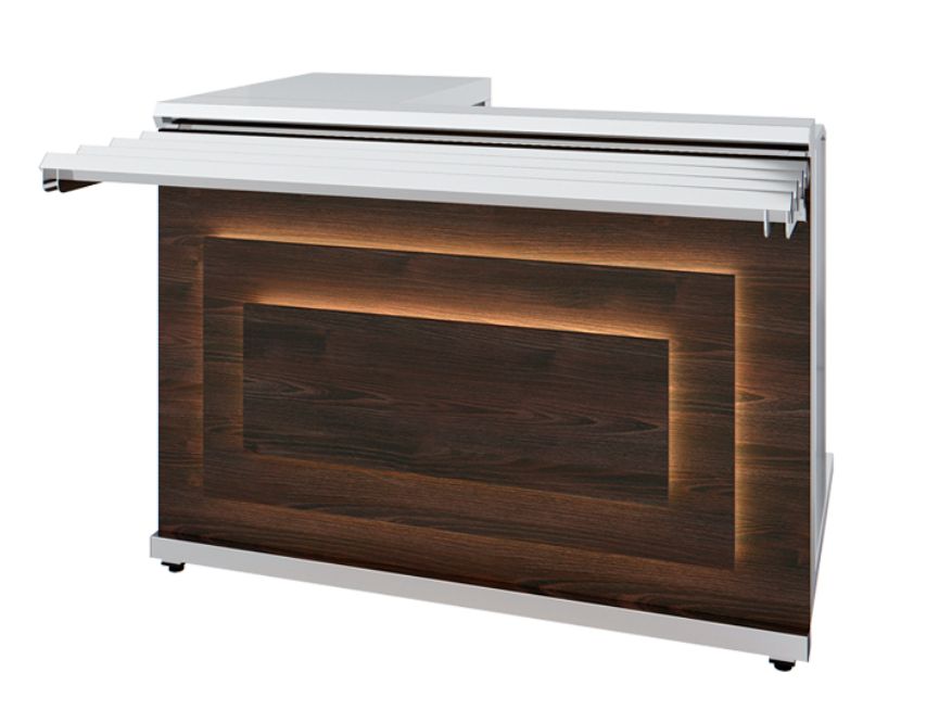 Прилавок кассовый, дополнительная полка для размещения кассового аппарата, так же отверстие для прокладки кабеля, возможность переставить угол с полкой на другую сторону, подсветка не входит в состав модулей.
