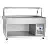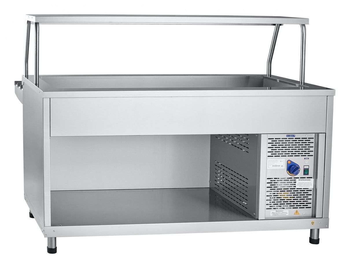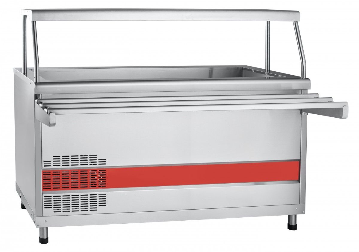 Линия раздачи Аста, хладагент R404A, охлаждаемая ванна h=85 мм площадью 0,69 м2, температурный режим витрины +1...+10°С, LED-подсветка, 1 полка площадью 0,47 м2, нейтральный шкаф для хранения, направляющие без стыков, регулируемые по высоте ножки.