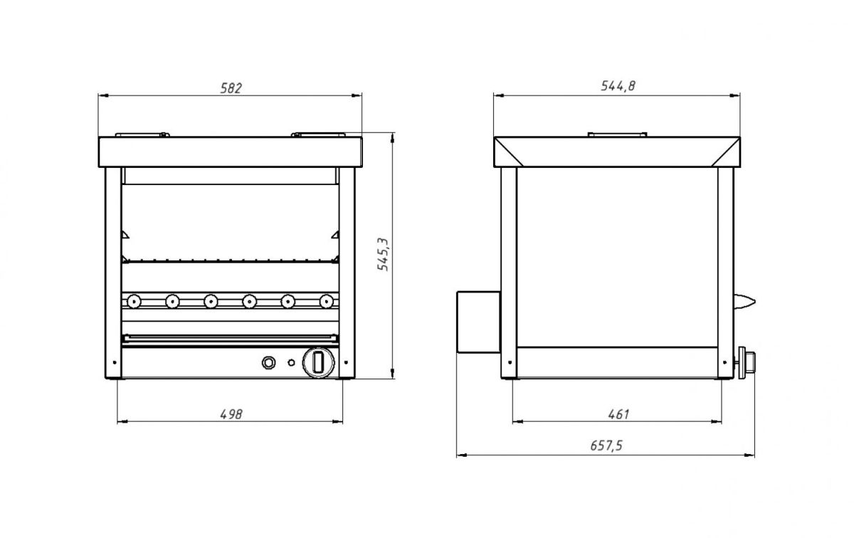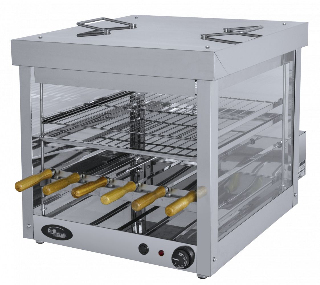 6 шампуров, решетка для барбекю, электропривод шампуров, стеклянная задняя и боковые стенки.