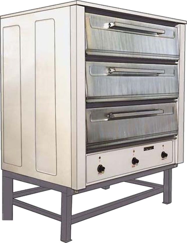 3 камеры (пода), вместимость 6 емкостей, 2 уровня в одной камере, размеры камеры 1000х760х180 мм, производительность белых батонов 60 шт/ч, время разогрева до 280 °С не более 50 мин.