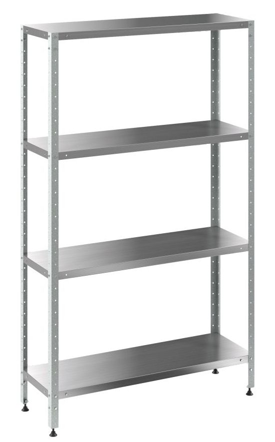 Каркас уголок оцинкованная сталь 40*40 мм толщиной 1,5 мм, 4 сплошные полки нержавеющая сталь толщиной 0,8 мм, усиление полки оцинкованная сталь толщиной 0,8 мм, шаг регулировки полок 60 мм, максимальная равномерно распределенная нагрузка на полку - до 80 кг.