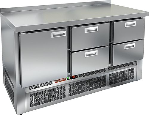 Нижнее расположение агрегата, борт, температура -2...+10 °С, объем 320 л, столешница из нерж. стали толщиной 50 мм, 1 дверь, 4 ящика, борт высотой 50 мм.