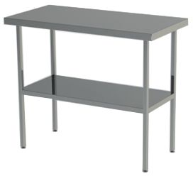 Цельносварной, без борта, полка сплошная, столешница нерж.сталь, края столешницы с подгибом, толщина столешницы 40 мм, каркас профильная труба 25х25, полка нерж.сталь, регулируемые опоры, нагрузка на стол не более 120 кг.