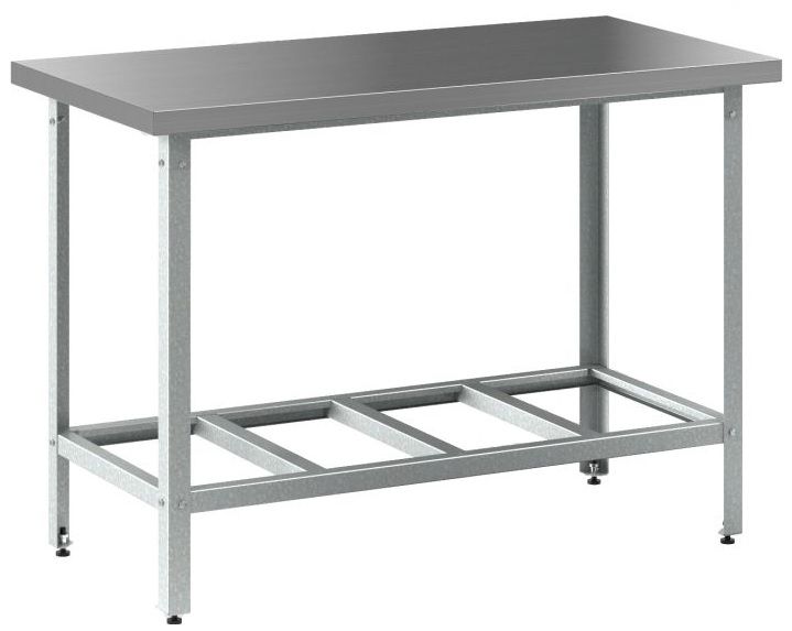 Без борта, центральный, столешница - нержавеющая сталь AISI 430 толщиной 0,8 мм, усилена ЛДСП толщиной 16 мм, каркас - уголок из оцинкованной стали 40*40, толщиной 1,5 мм, полка-решетка из оцинкованной стали толщиной 0,8 мм, конструкция - разборная, регулируемые по высоте пластиковые опоры, допустимая равномерно распределенная нагрузка на столешницу - до 150 кг.