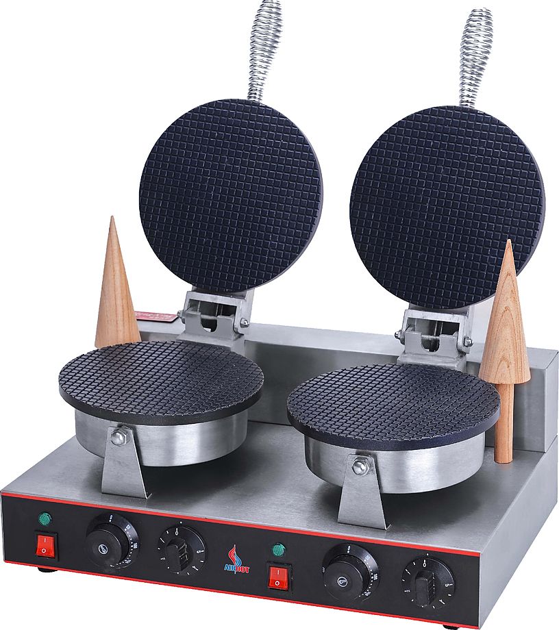 Тонкие вафли (на рожок), две рабочих поверхности по 210 мм, таймер, терморегулятор, толщина вафли 2-3 мм, время приготовления вафель 2-3 мин.