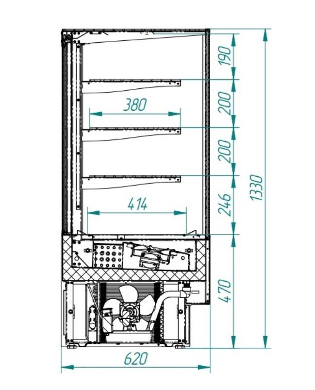 Площадь экспозиции 1,51 м2, глубина выкладки (навесные полки) 380 мм, 3 полки, LED-подсветка, температурный режим 0...+7С, хладагент R290.