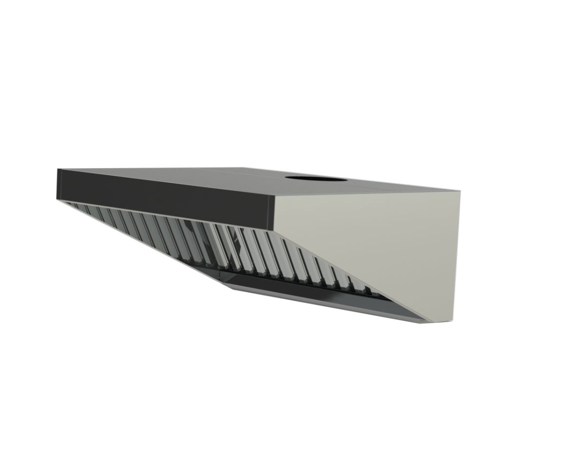 Пристенно-наклонный зонт из нержавеющей стали, подключение к вытяжной вентиляционной системе предприятия, диаметр воздухоотвода 250 мм, съемные лабиринтные жироуловители.